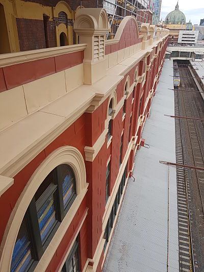 Project DescriptionExtensive repair and restoration works were carried out on the platform side of Flinders Street Train Station by National Pressed Metal, contracting arm of the Australian Pressed Metal Group. Teams from Melbourne Pressed Metal and Adelaide Pressed Metal worked closely with builder BUILT to restore the platform fascade to its original impressive condition. The majority of the overall restoration works of Flinders Street Train Station was completed on the platform side of the building. Original metal shingles on the fascade were repaired and restored as well as original metal arches, capitals and sills. 14 original metal vent stacks were also repaired and restored using soft zinc to keep the authentic heritage fabric of the building. Continuation of the replacement of 350 metres of lead flashing was also installed along the the platform fascade. Penetrations under the platform verandahs were also cut to allow for rain heads installation.